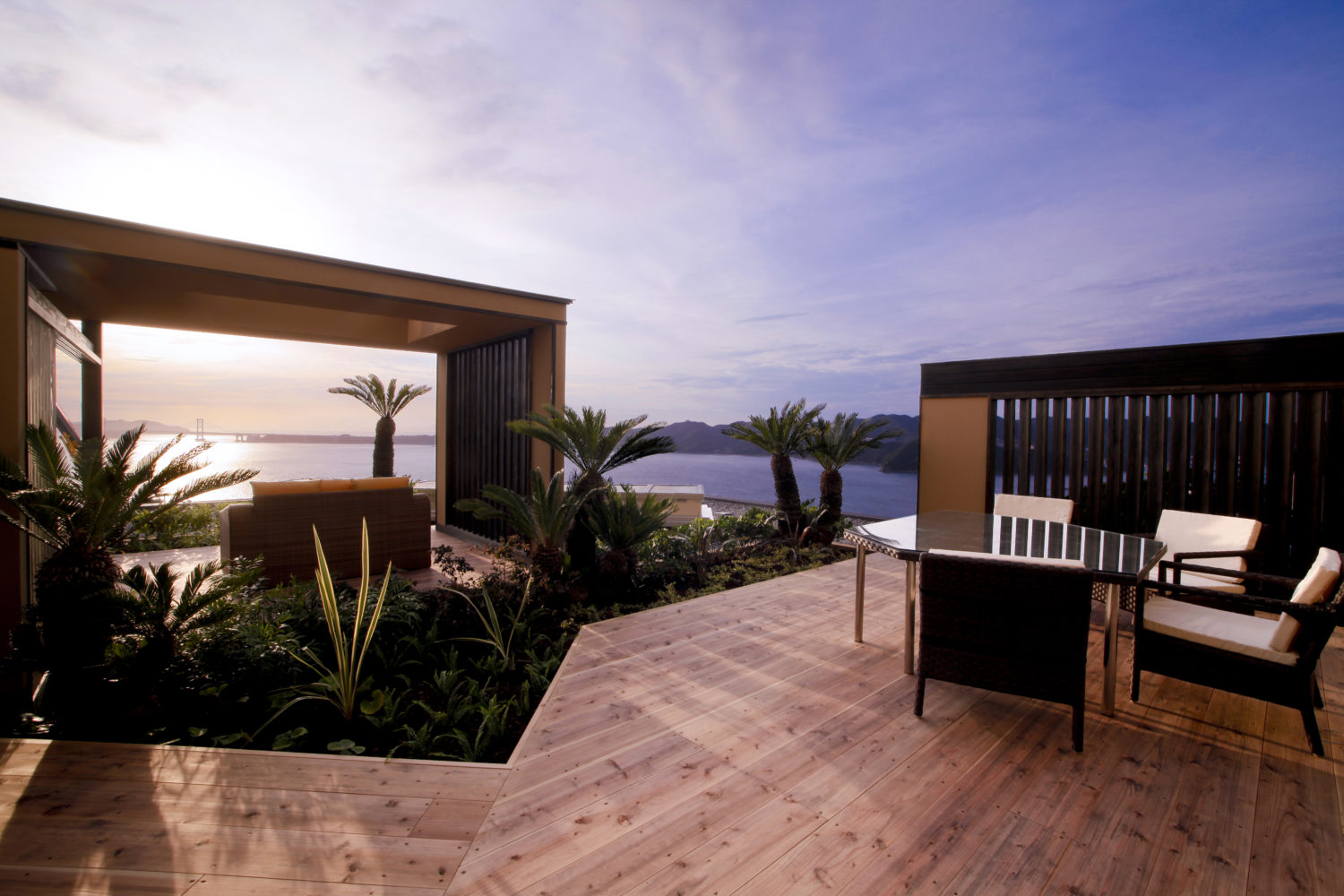 和室からリビングダイニング、ウッドテラスへと連続する空間構成は、そのまま鳴門海峡の景色へと視線が抜ける設計となっており、建物と風景が一体となる体験を生み出しています。