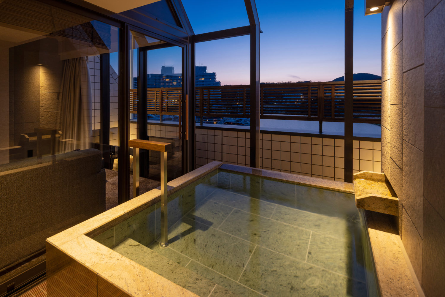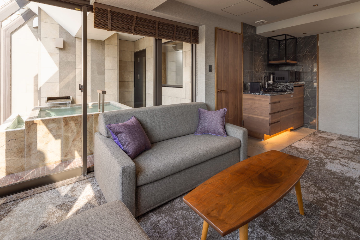 専有露天風呂を備えた客室においては、内外のつながりを意識しながら、視線の抜けや仕上げの納まりに細部まで配慮しました。